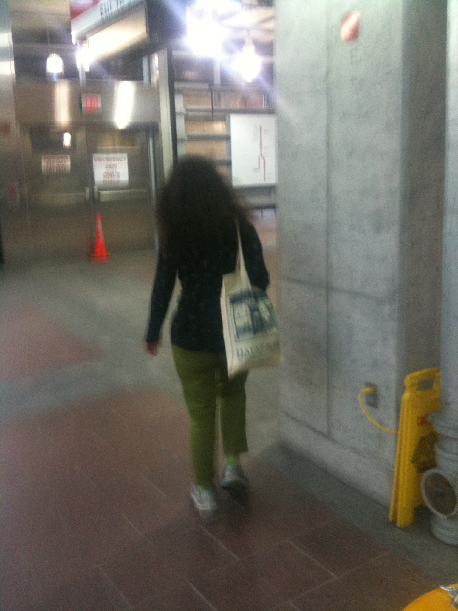 [I run into the elevator just as it's closing. Middle-Aged Lady (pictured above) is only other person in elevator, facing away from me]